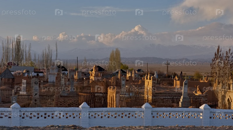 Каракол, Кыргызстан. 21 апреля 2024. деревенское кладбище на закате весеннего солнца