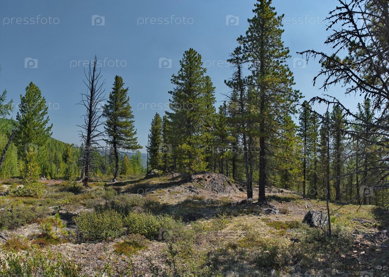 Панорама скалистой вершины горного перевала, окруженной деревьями тайги