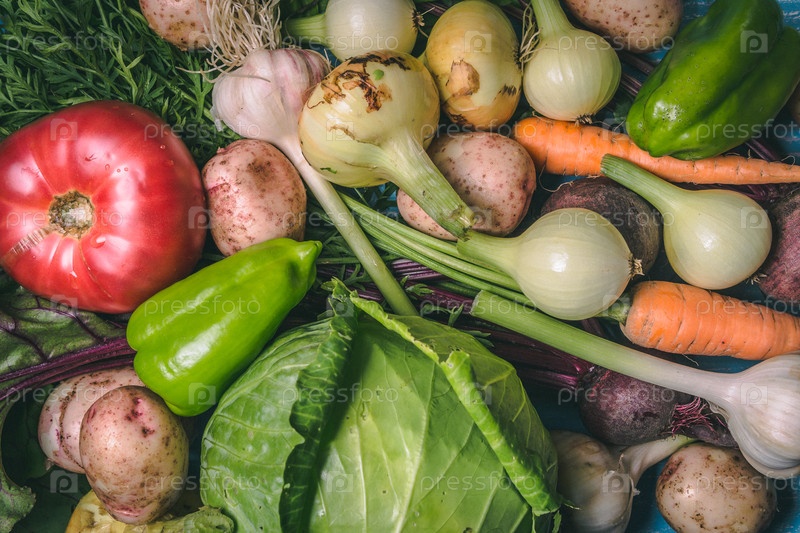 Томат, капуста, лук, картофель, перец, чеснок, морковь и свекла. Овощи в корзине на синем фоне. Свежие сезонные овощи