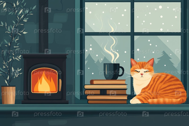 Уютная сельская жизнь с дровяной печью и сонным котом в холодный день
