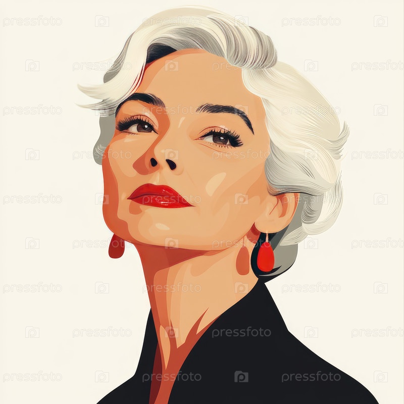 Современный портрет представляет собой пожилую женщину с выразительными морщинами, ярко-красной помадой и минималистическими серьгами.Ее нейтральное выражение излучает уверенность на чистом белом фоне