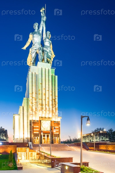 Символом советской эпохи является памятник 'Рабочая и колхозная женщина' в свете ночного города.Москва