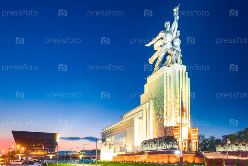 Символом советской эпохи является памятник 'Рабочая и колхозная женщина' в свете ночного города.Москва