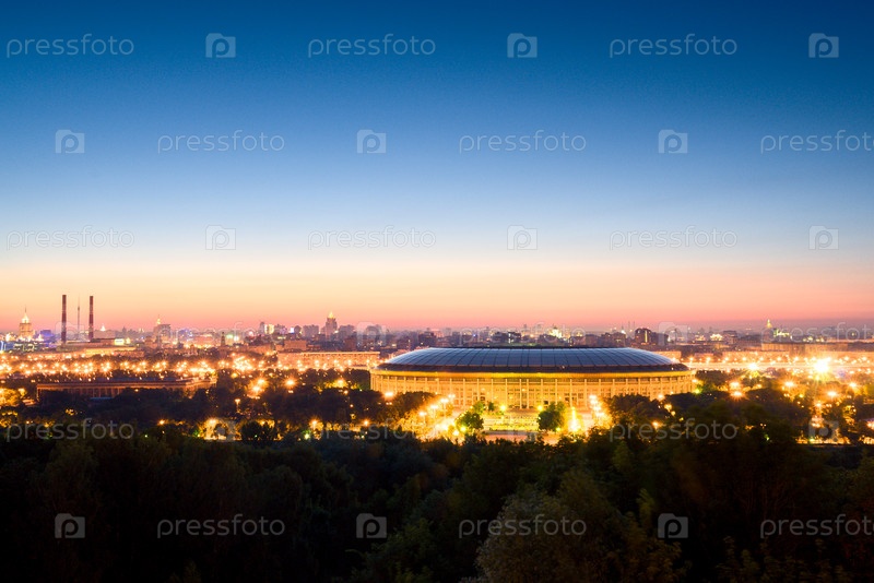 Завораживающий предрассветный городской пейзаж футбольного стадиона Лужники в Москве