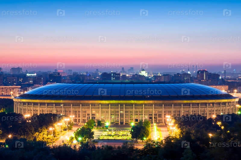 Завораживающий предрассветный городской пейзаж футбольного стадиона Лужники в Москве