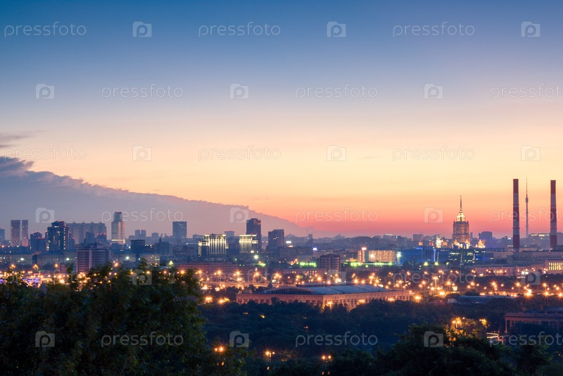 Увлекательный перед рассветным городской пейзаж Москвы летом