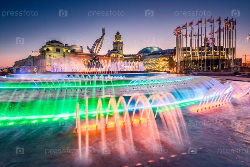 Вечерний вид Европейской площади и фонтана 'Похищение Европы' на Киевском вокзале в Москве