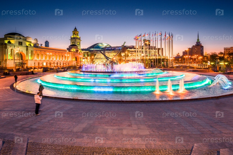 Вечерний вид Европейской площади и фонтана 'Похищение Европы' на Киевском вокзале в Москве