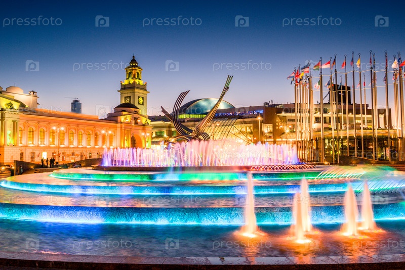 Вечерний вид Европейской площади и фонтана 'Похищение Европы' на Киевском вокзале в Москве