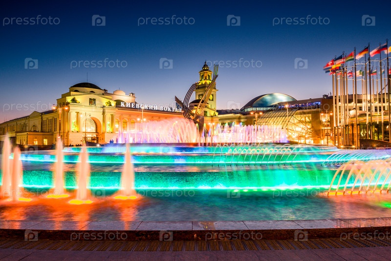 Вечерний вид Европейской площади и фонтана 'Похищение Европы' на Киевском вокзале в Москве