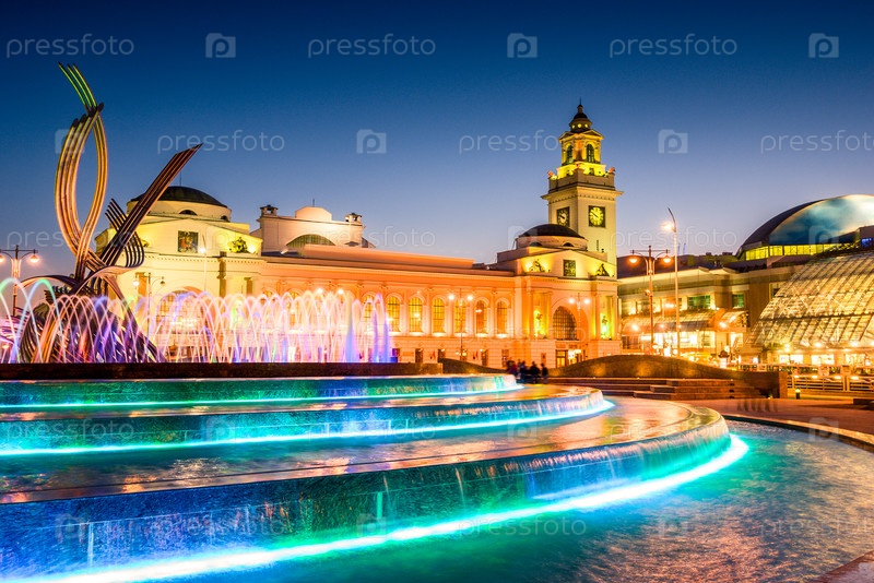 Вечерний вид Европейской площади и фонтана 'Похищение Европы' на Киевском вокзале в Москве