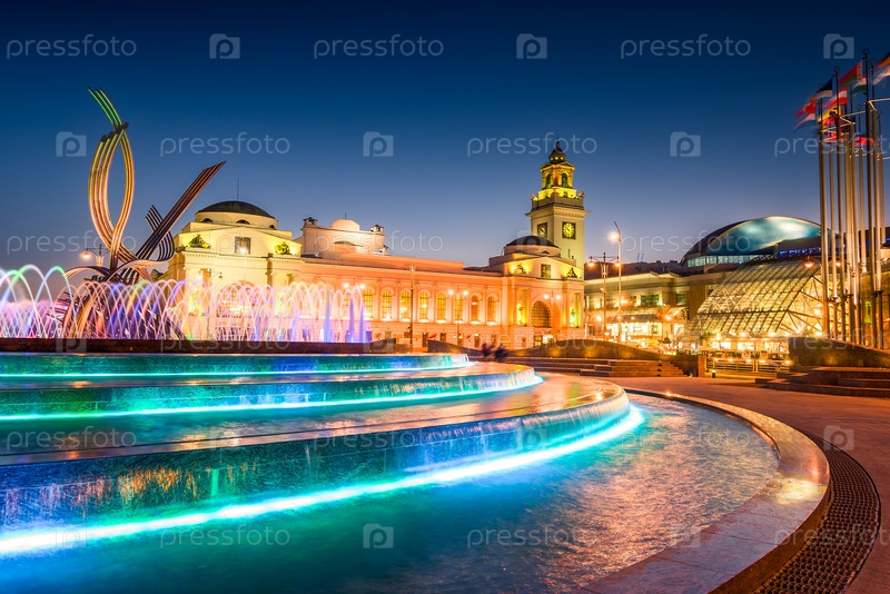 Вечерний вид Европейской площади и фонтана 'Похищение Европы' на Киевском вокзале в Москве