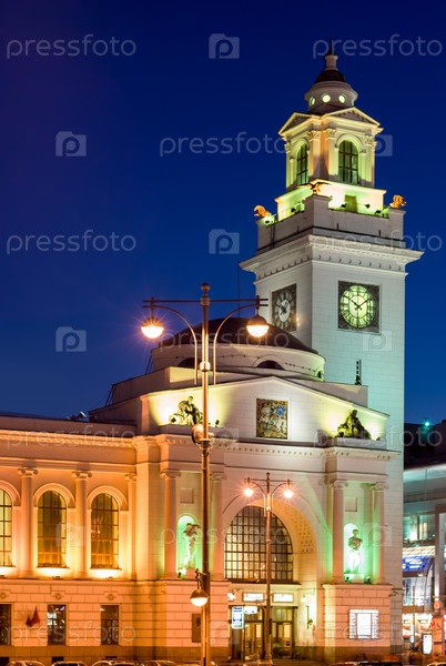 Ночной вид редкой часовой башни Киевской станции в Москве
