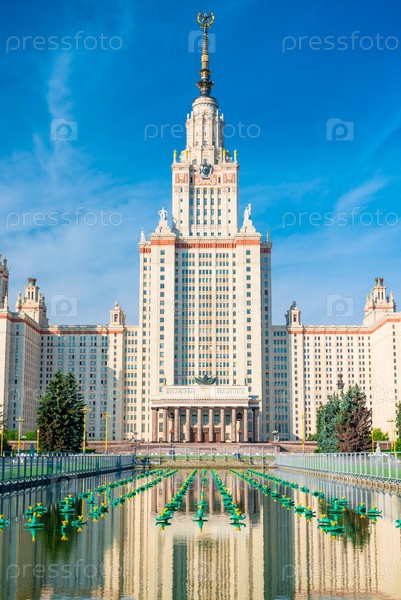 Прекрасный вид на сталинскую высотную башню Московского государственного университета имени Ломоносова с отражением в фонтане с лилиями