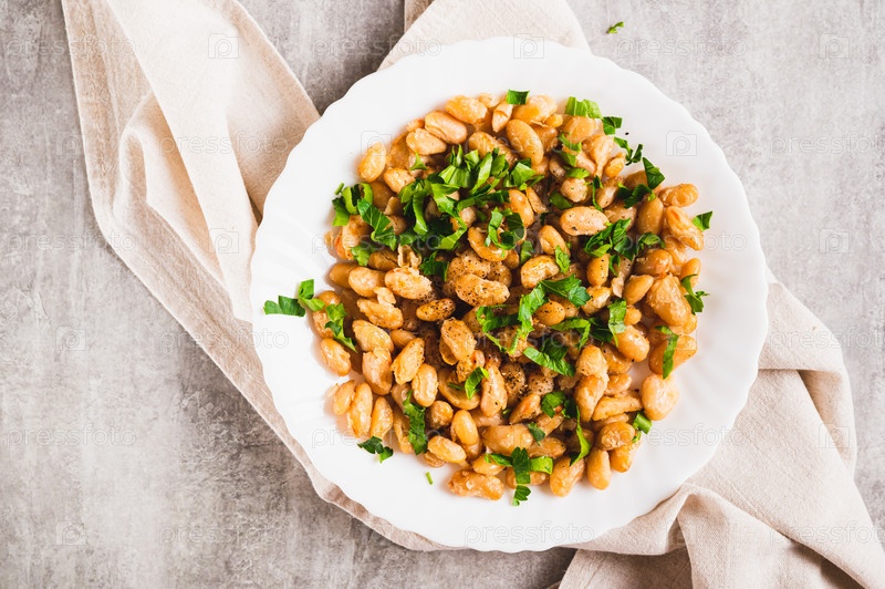 Близкий план теплого белого жареного фасольного салата и петрушки на тарелке на столешнице