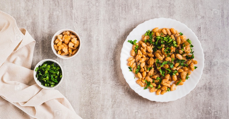 Домашний салат из жареных белых бобов и зелени на тарелке на баннере сайта столешницы