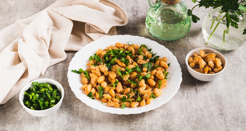 Теплый белый жареный фасольный салат и петрушка на тарелке на столе WEB баннер