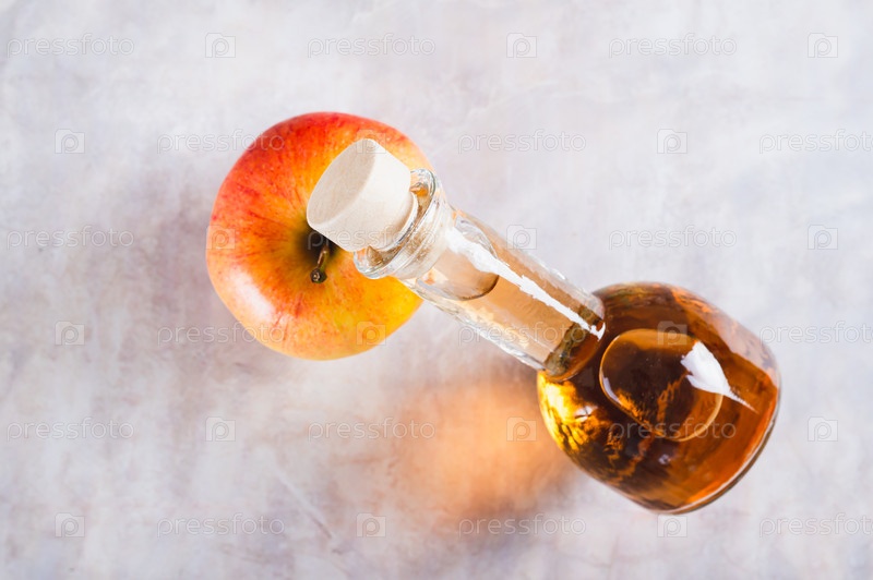 Близкий план яблочного уксуса в бутылке на свежем яблоке на столешнице