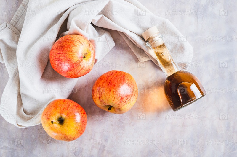 Яблочный уксус в бутылке и свежие яблоки на столешнице