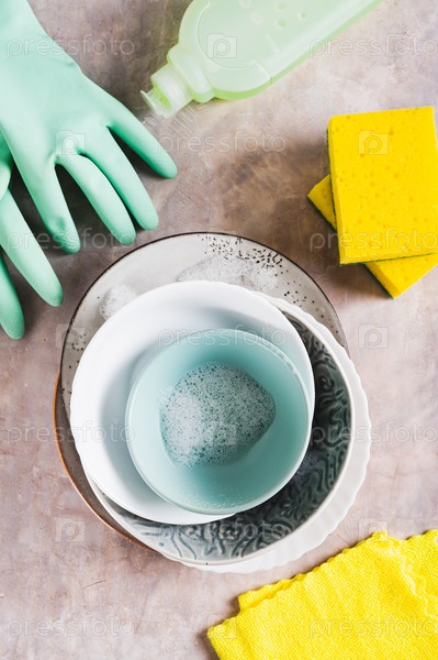 Мытье грязной посуды и моющих предметов на столешнице в вертикальном положении