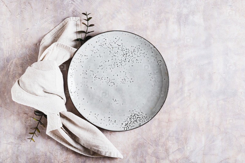 Пустая серая керамическая плита и салфетка на светлом фоне вид сверху
