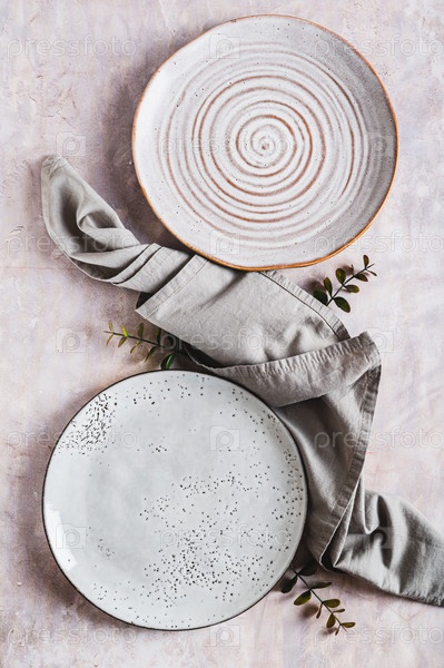 Пара пустых керамических пластинок с салфеткой на сером фоне вверху и вертикальным видом