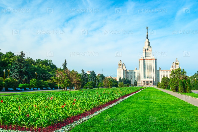 Прекрасный солнечный вид на сталинскую высотку МГУ имени М.В. Ломоносова. Россия