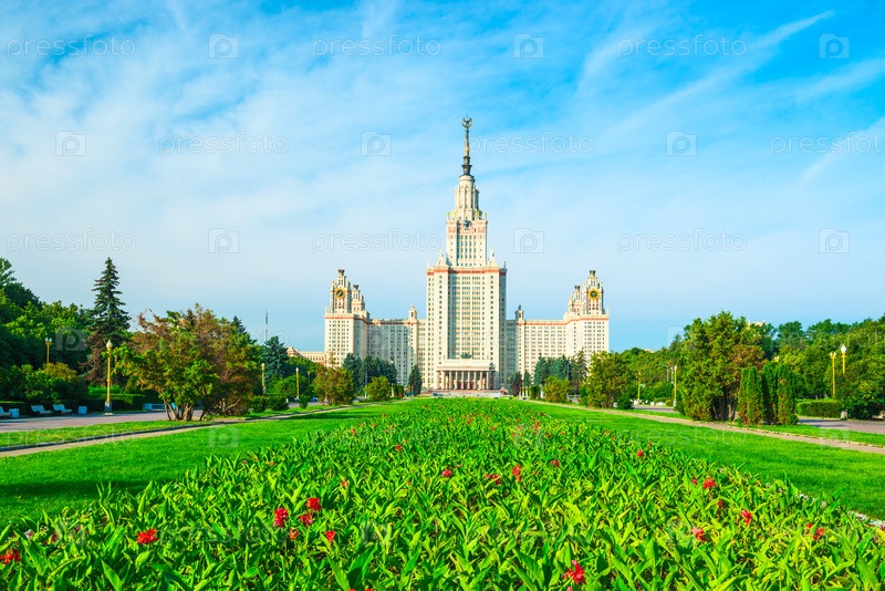 Прекрасный солнечный вид на сталинскую высотку МГУ имени М.В. Ломоносова. Россия