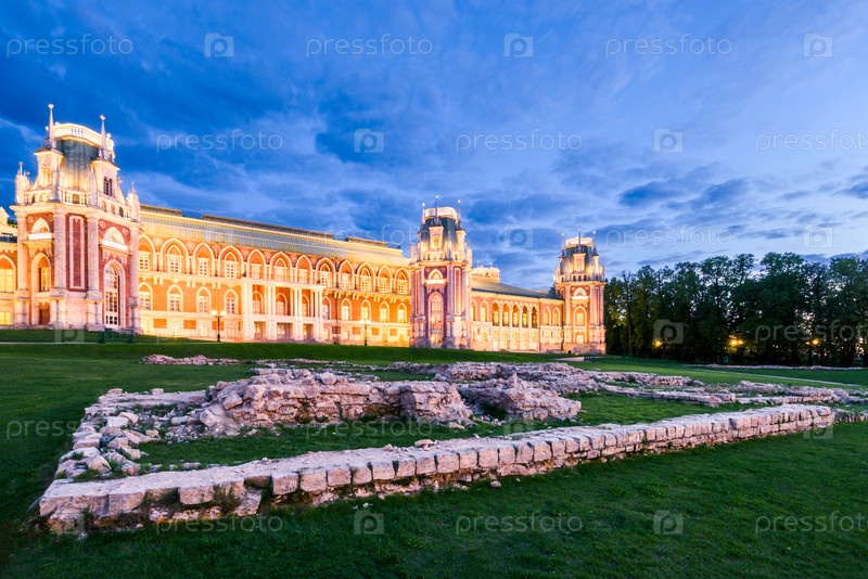 Вечерний вид на ансамбль усадьбы Царицыно, Большой дворец. Москва, Россия