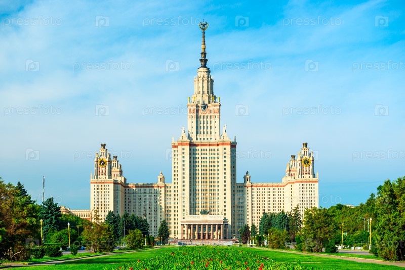 Прекрасный солнечный вид на сталинскую высотку МГУ имени М.В. Ломоносова. Россия