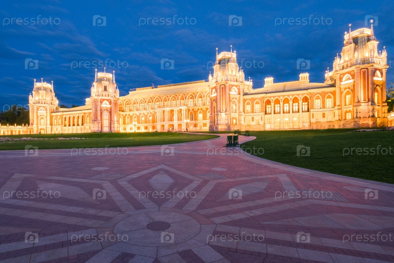 Вечерний вид на ансамбль усадьбы Царицыно, Большой дворец. Москва, Россия