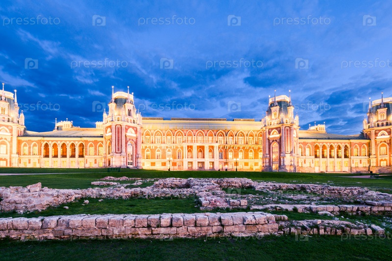 Вечерний вид на ансамбль усадьбы Царицыно, Большой дворец. Москва, Россия