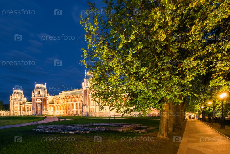 Вечерний вид на ансамбль усадьбы Царицыно, Большой дворец. Москва, Россия