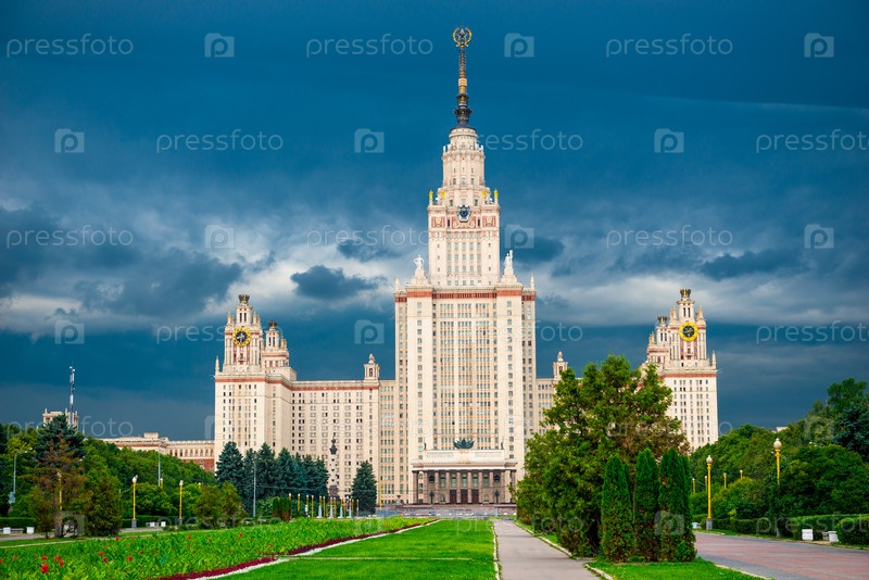 Громовой драматический вид на сталинскую высотку МГУ имени М.В. Ломоносова. Россия