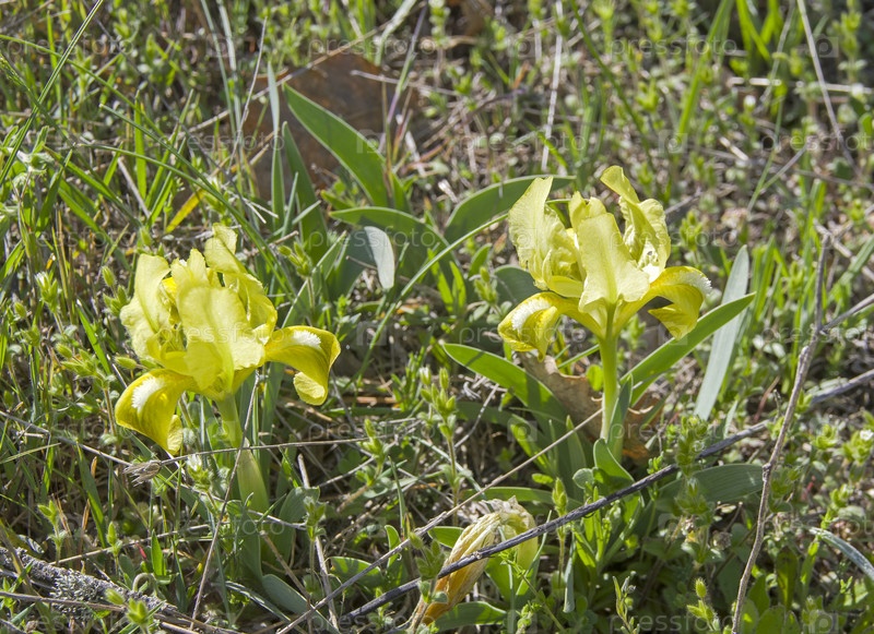 Цветущий желтый карликовый ирис (лат. Iris pumila). Крым, апрель