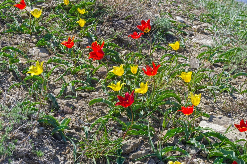Тюльпан Шренка (лат. Tulipa suaveolens) на каменистом глинистом горном склоне. В России этот вид тюльпанов занесен в Красную Книгу. Мыс Меганом, Крым, конец апреля