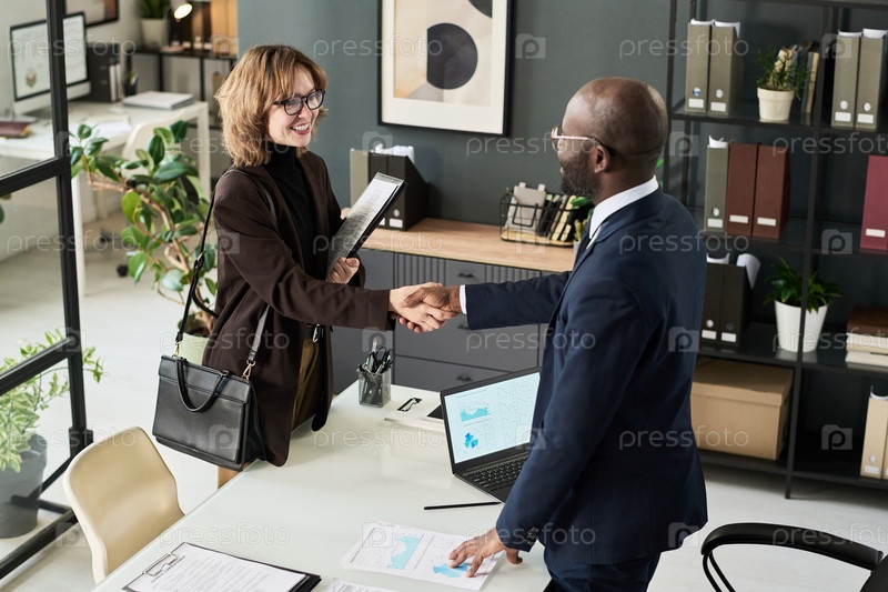 Бизнесмен приветствует женщину в офисе