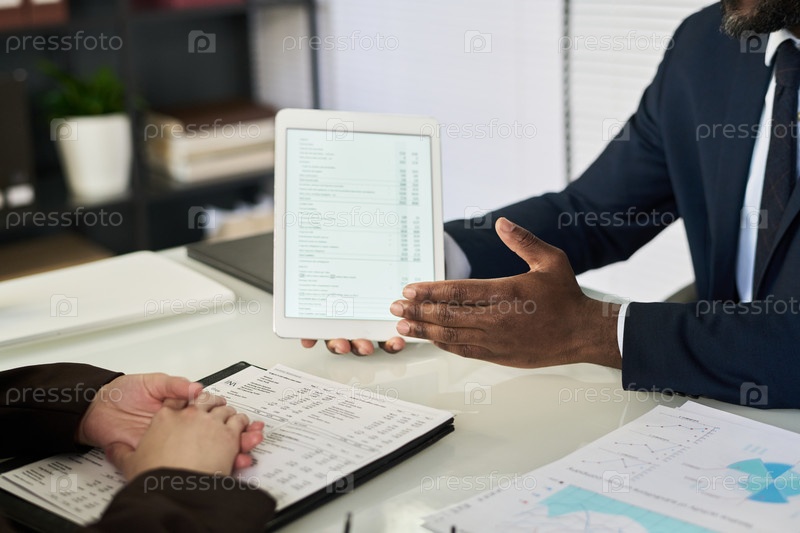 Бизнесмен обсуждает финансовый отчет на планшетном ПК