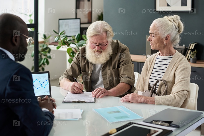 Старшая пара заключает контракт в офисе