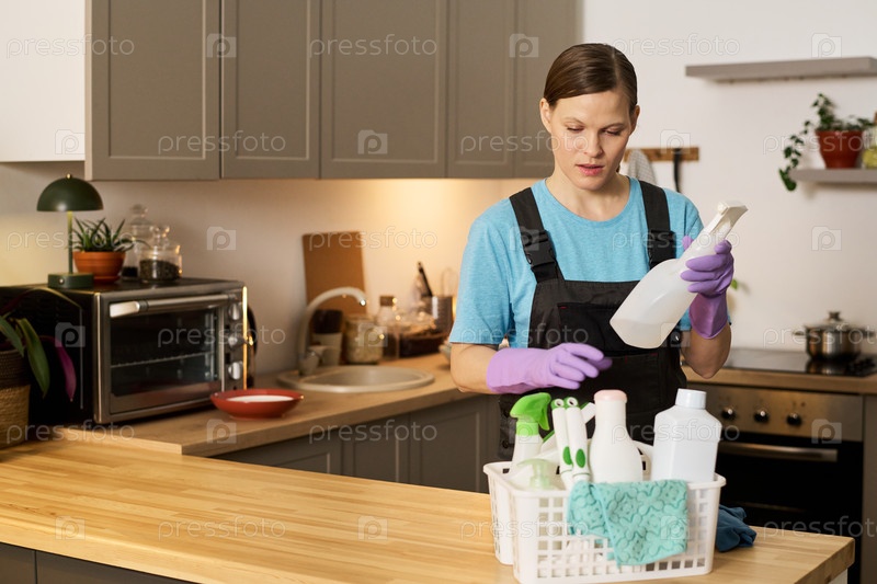 Чистящий работник выбирает моющие средства для чистки