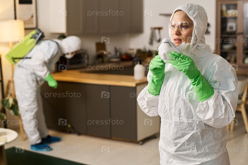 Женщина, носящая защитный костюм во время дезинсекции