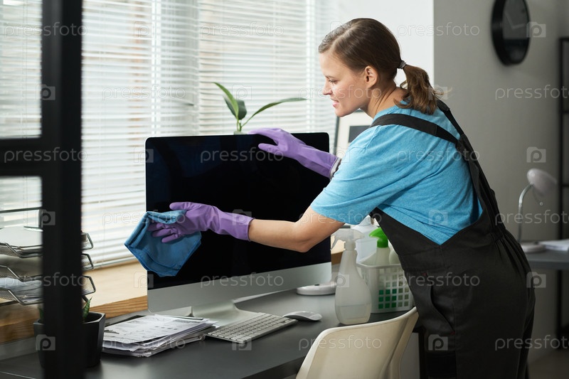 Уборка экрана компьютера в офисе Женщина