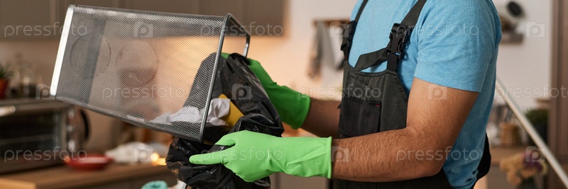 Мужчина, бросающий мусор в сумку во время домашней работы