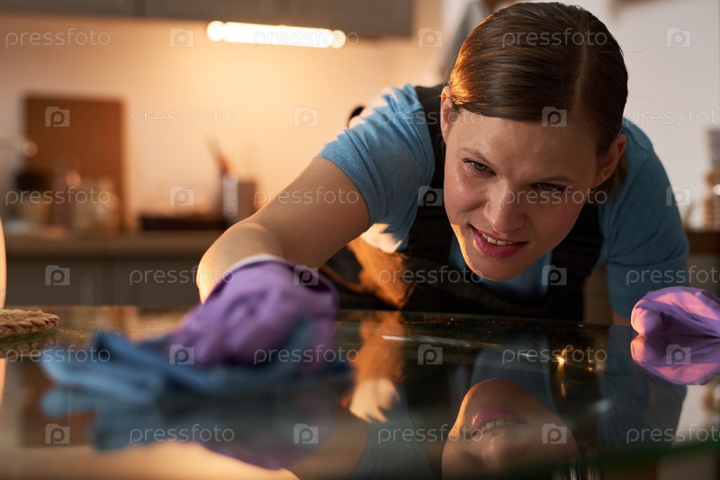 Женщина, убирающая стеклянный стол во время чистки дома