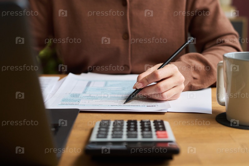Непризнанная женщина-бухгалтерка просматривает счетный документ