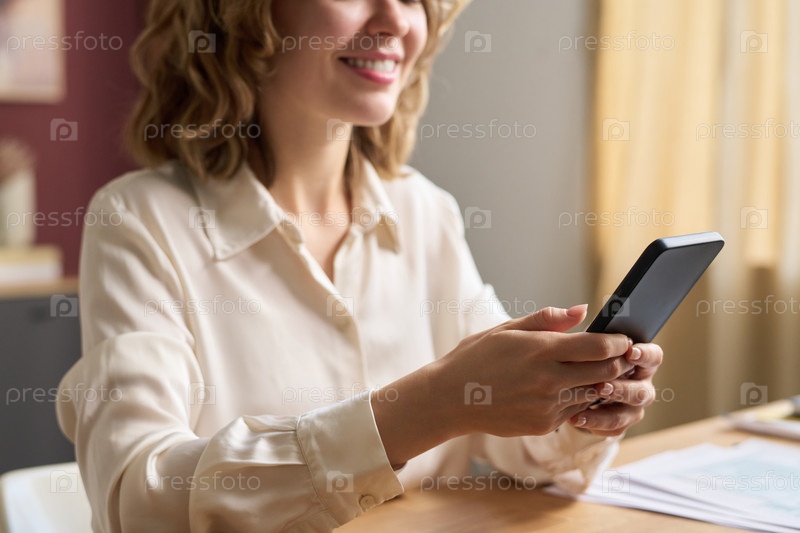 Улыбающаяся женщина отправляет сообщения по смартфону на работе