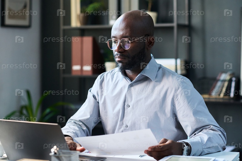 Черный бизнесмен, работающий с документами