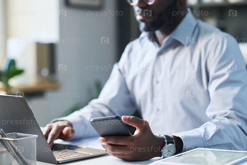 Чёрный мужчина директор компании использует смартфон и ноутбук в офисе