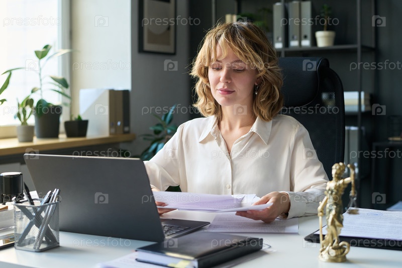 Молодая женщина-адвокат просматривает юридические документы