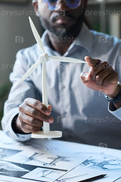 Черный мужской инженер, держащий и вращающий ветряную турбину